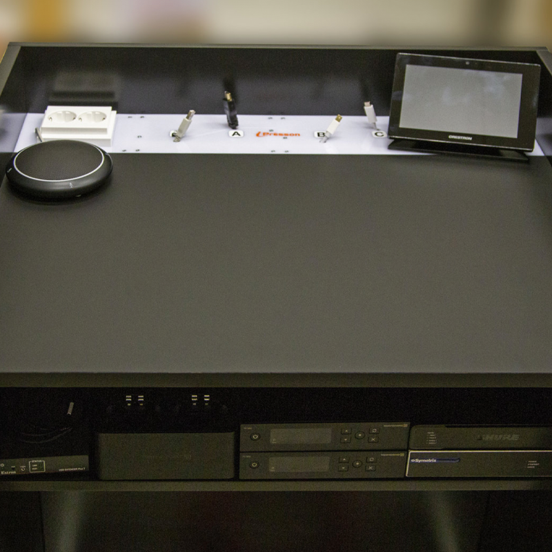 Presson Cabin -näyttökaluste tiloihin, joissa ei haluta tekniikan olevan esillä koko ajan tai se sijoitettaisiin esim. ikkunan eteen.