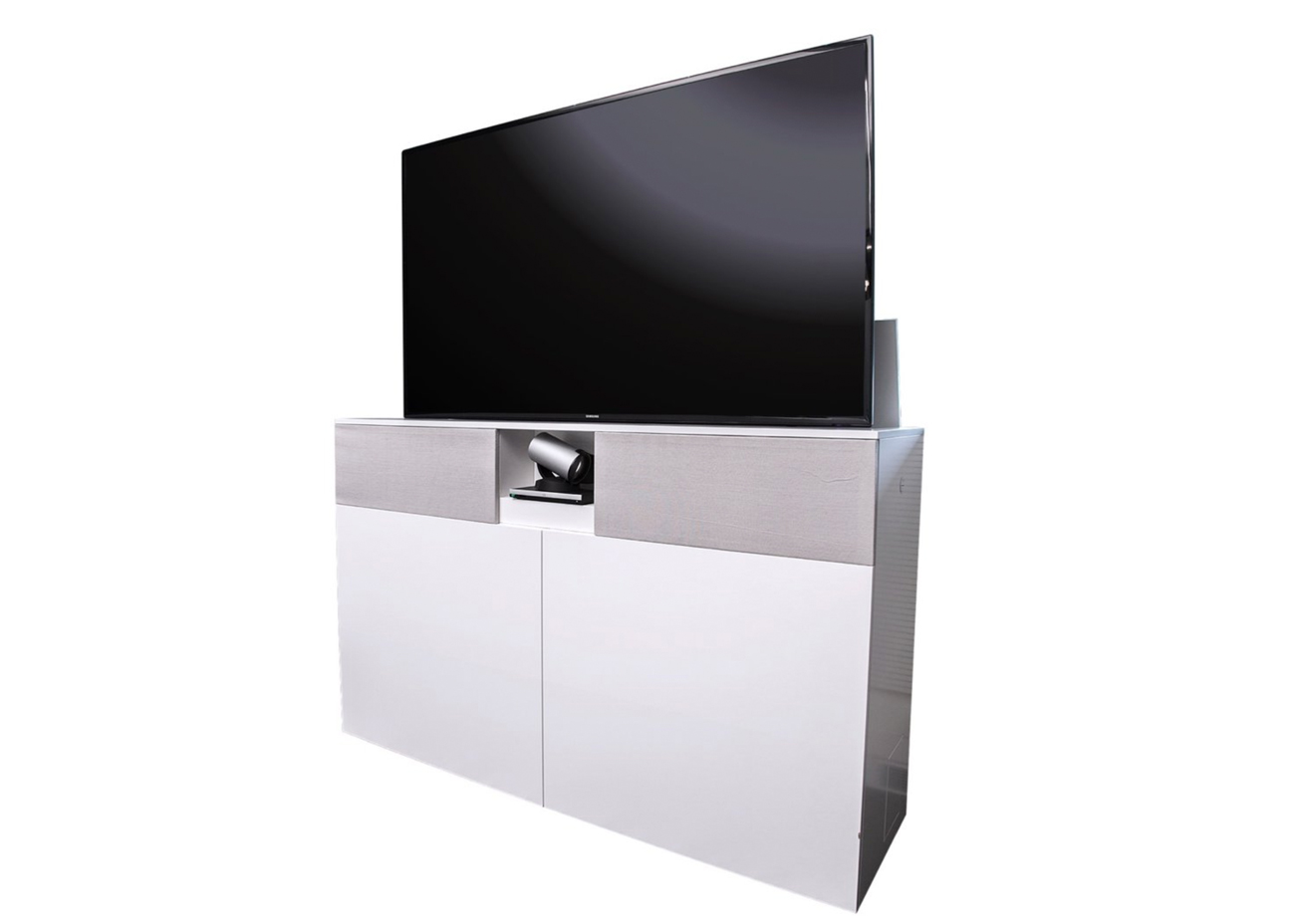 Presson näyttökaluste hissimekanismilla piilottaa tekniikan näkyvistä!
